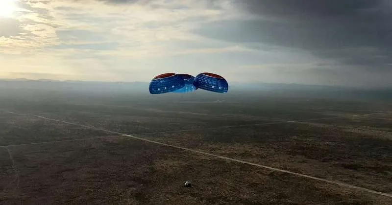 A continuación, se abren tres gigantescos paracaídas que permiten a los pasajeros descender en el desierto texano.
