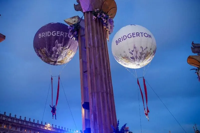 La histórica plaza se transformó en un gran salón a cielo abierto, animado por bailarines profesionales vestidos con trajes de época inspirados en la popular serie.