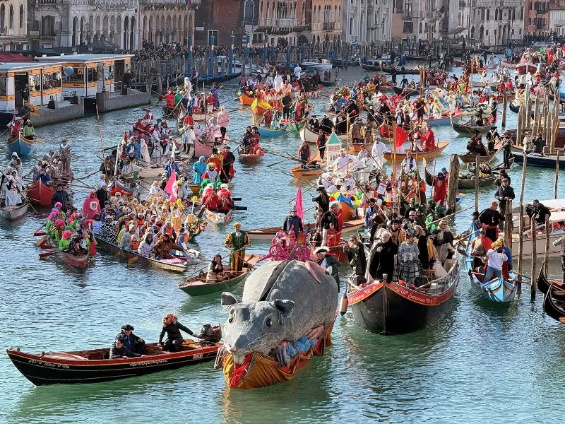 Un centenar de embarcaciones a remo decoradas, conducidas por remeros en traje de época, desfilaron desde Punta della Dogana hasta Rialto, encabezadas por la histórica "Pantegana" de cartapesta.