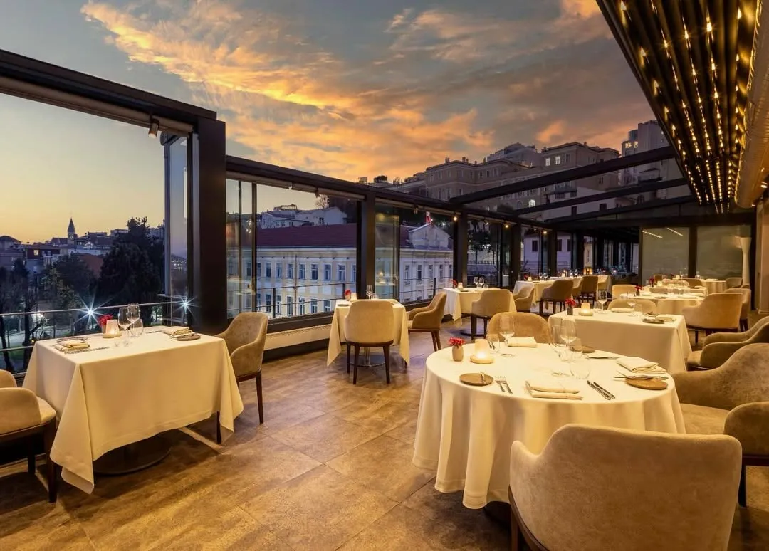 Además, la carta de vinos, con una amplia selección de etiquetas turcas, complementa a la perfección la experiencia. Los aperitivos se sirven en un salón con espectaculares vistas de la ciudad, y los comensales pueden ver a los chefs en acción en el comedor principal.