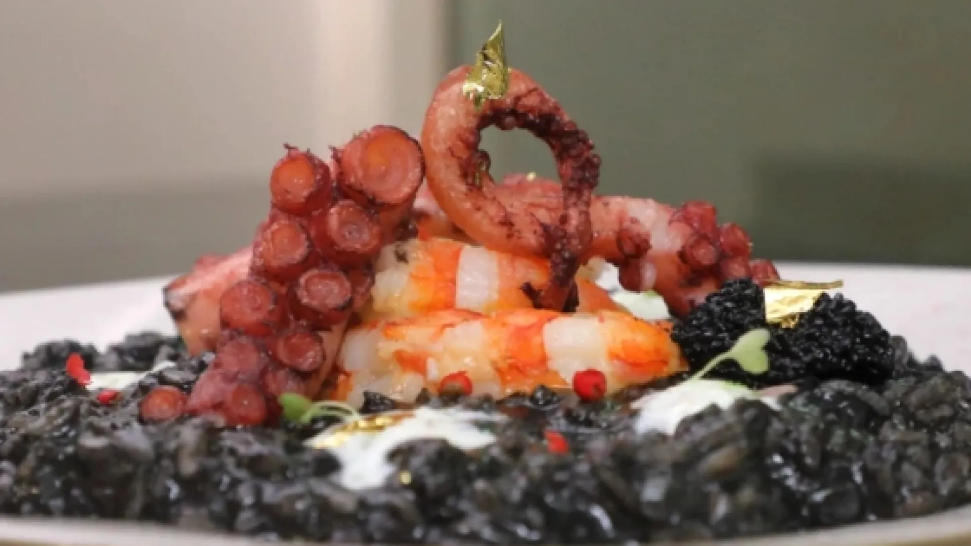 El Sommelier presenta el maridaje para este risotto, que es un Pinot Pinot, de la Bodega Catena Zapata que combina dos viñedos diferentes, Adrianna y Vicente provenientes de Mendoza, “este pinot reserva acompaña la intensidad de la tinta de calamar, y los sabores que se encuentran en los mariscos y en la exquisitez del caviar”.