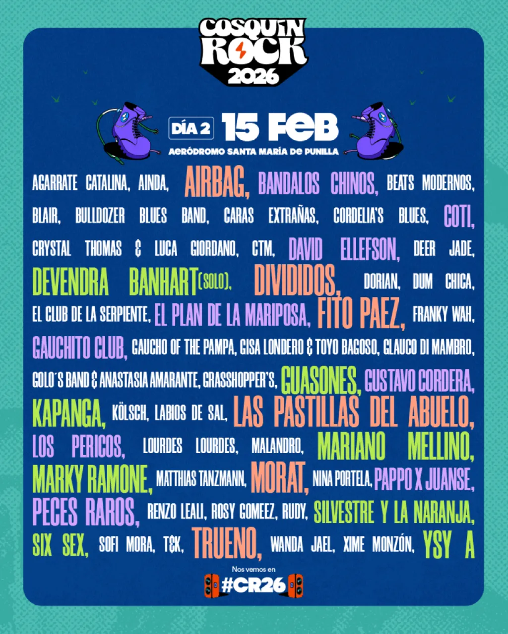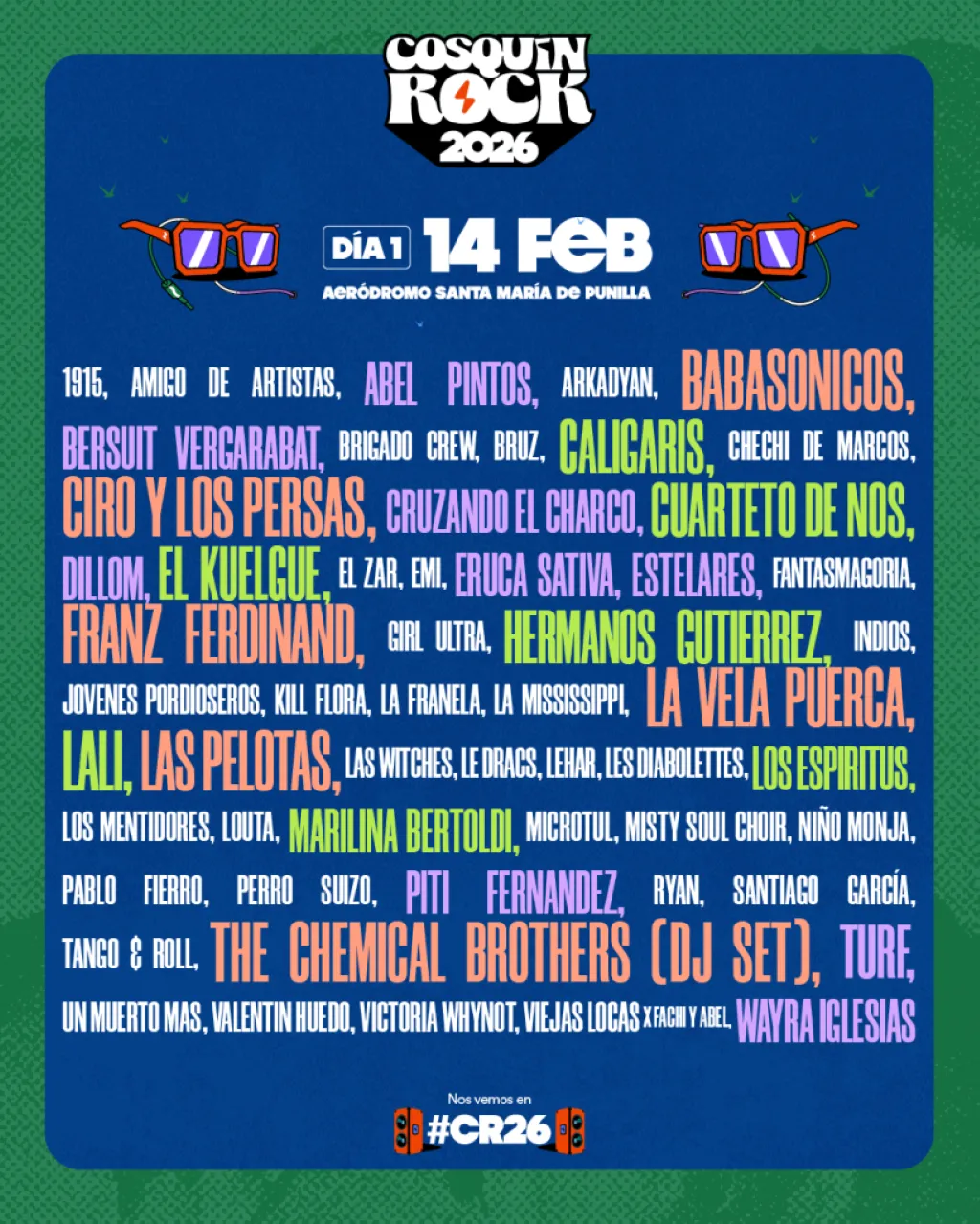 Con más de cien artistas nacionales e internacionales confirmados, Cosquín Rock 2026 prepara su edición número 26 en el Aeródromo de Santa María de Punilla, Córdoba, los días 14 y 15 de febrero. Durante dos jornadas, el público podrá disfrutar de un cruce único de géneros y generaciones con figuras internacionales como Franz Ferdinand, The Chemical Brothers (DJ Set), Devendra Banhart, Morat y Hermanos Gutiérrez, junto a referentes locales como Babasónicos, Divididos, Fito Páez, Las Pastillas del Abuelo, Ciro y Los Persas, Las Pelotas, Los Caligaris, Airbag y Lali, entre muchos más.
