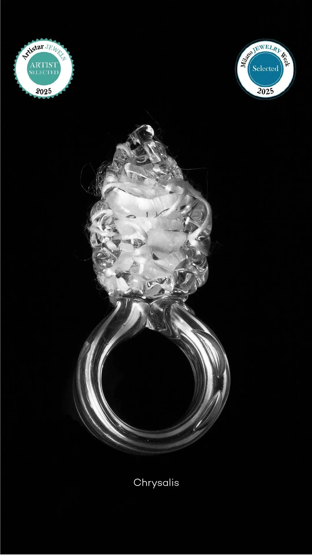 Ese recorrido la llevó a ser seleccionada para participar de la Milano Jewelry Week 2025, el evento internacional más relevante de la joyería contemporánea. Allí presentó piezas realizadas con capullos de seda -su sello distintivo- combinados con plata 925 y vidrio soplado.