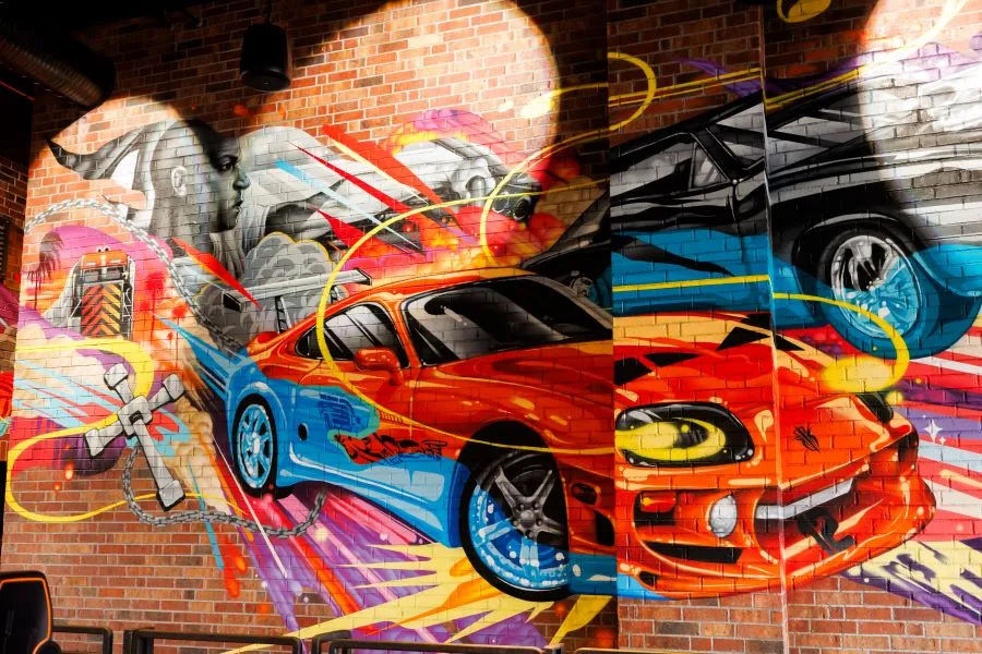 Incluido en este mural hay un homenaje al personaje Dominic Toretto, interpretado por Vin Diesel. La obra transmite simultáneamente una sensación de adrenalina mientras los visitantes se preparan para ser transportados al universo de Rápidos y Furiosos de Universal Pictures.