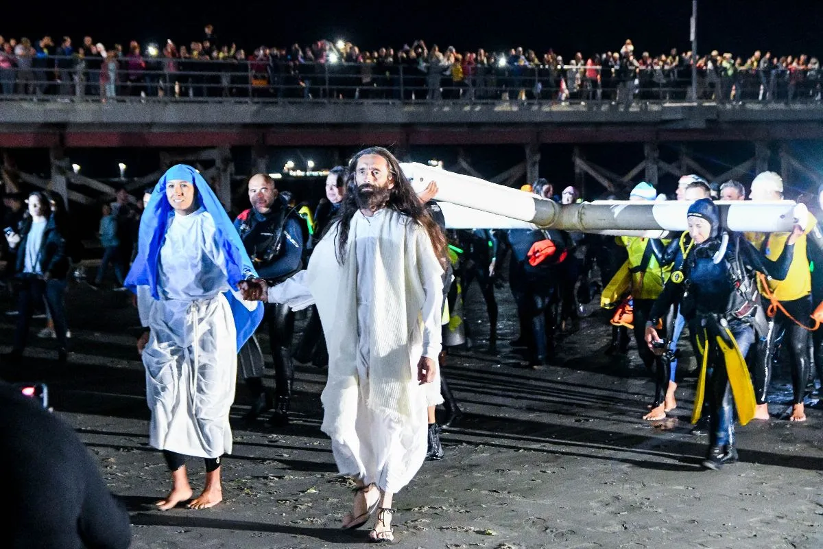 Allí se desarrolla el momento más emblemático de la celebración: la inmersión de la cruz de casi cuatro metros de altura en las aguas del Golfo Nuevo. A partir de ese punto, las estaciones restantes continúan bajo el mar, a lo largo de unos 500 metros y a aproximadamente ocho metros de profundidad.