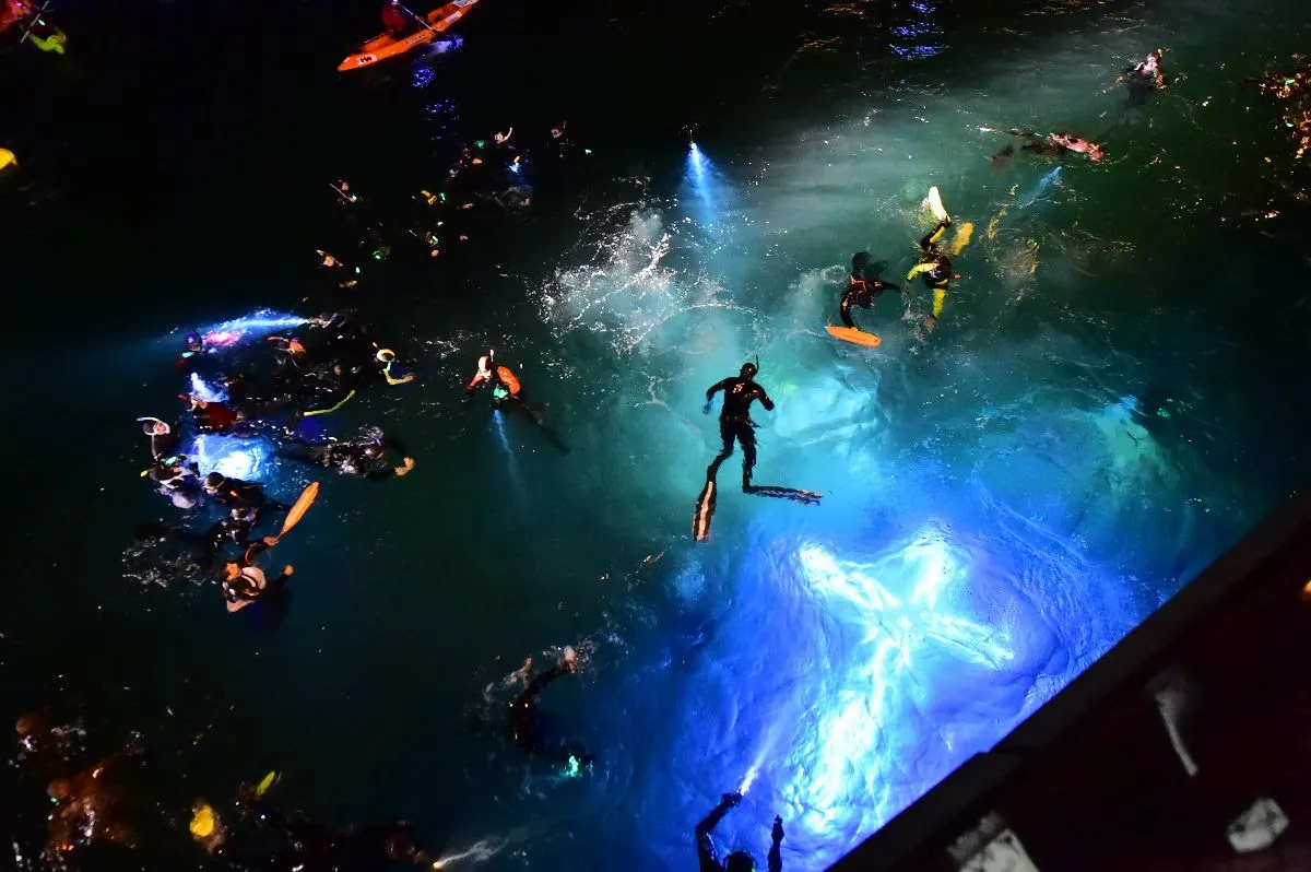 Entre quienes protagonizan este momento se encuentra, como cada año, “Pinino” Orri, reconocido buzo de la ciudad que desciende con su característica escafandra y acompaña el recorrido submarino de la cruz. A su alrededor se suman otros buzos, kayakistas y pequeñas embarcaciones que siguen el trayecto desde el agua, mientras cientos de personas observan desde el muelle y la costa. A medida que cae la tarde, el clima del evento adquiere una atmósfera particular: el público comienza a encender velas y, desde el mar, se proyecta el resplandor de la cruz iluminada, junto con las luces de los equipos que portan los buzos y las embarcaciones. La escena genera una postal única para quienes presencian el acontecimiento desde la costa o desde el muelle.