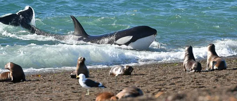 Las orcas de la Península Valdés son mundialmente conocidas por desarrollar una estrategia de alimentación única llamada varamiento intencional. Durante esta maniobra, los animales se impulsan deliberadamente fuera del agua en marea alta para capturar crías de lobos o elefantes marinos cerca de la orilla. Se trata de uno de los comportamientos predatorios más espectaculares de la vida salvaje marina y fue documentado por primera vez en 1974 en esta región.