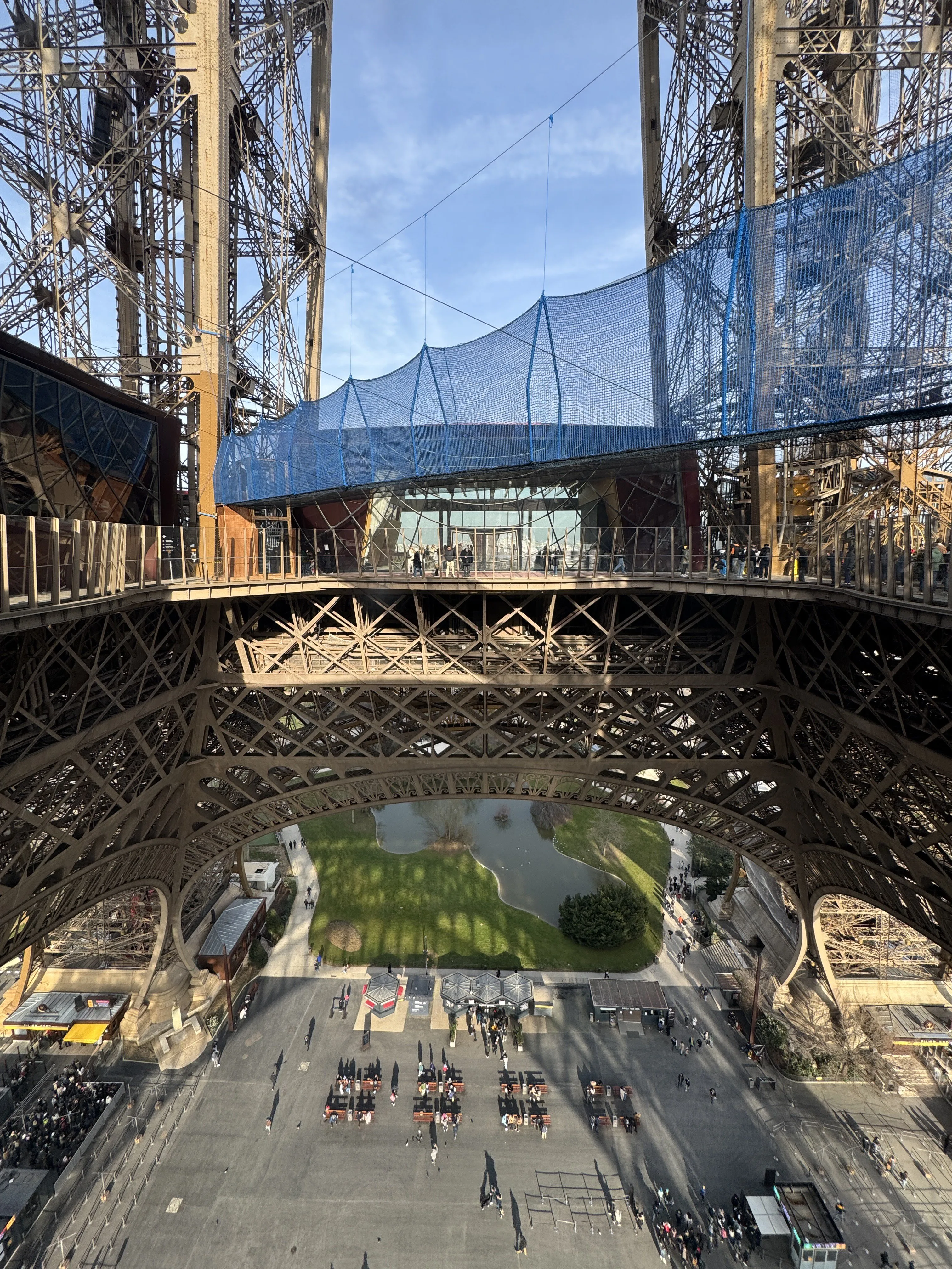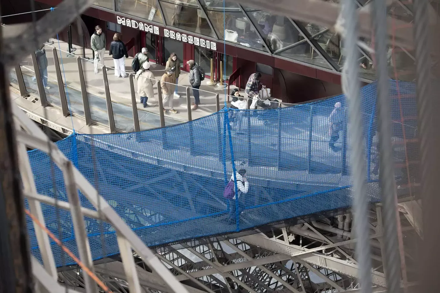 Suspendido entre los pilares este y oeste del monumento, el puente Vértige de la Tour ofrece un cruce aéreo de unos cuarenta metros hasta casi 60 metros sobre el suelo. Esta pasarela peatonal de red, diseñada por la empresa especializada Arboricorde, es el puente colgante más alto de Francia en un entorno urbano. Sujeta firmemente por un conjunto de cables y protegida por varias capas de redes que suman más de 25.000 mallas, la estructura te permite literalmente caminar sobre el vacío mientras disfrutas de una vista espectacular de la Dama de Hierro y París.